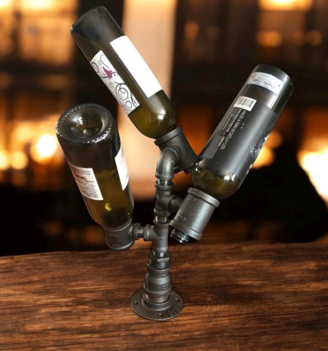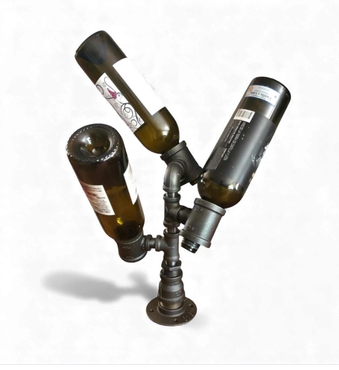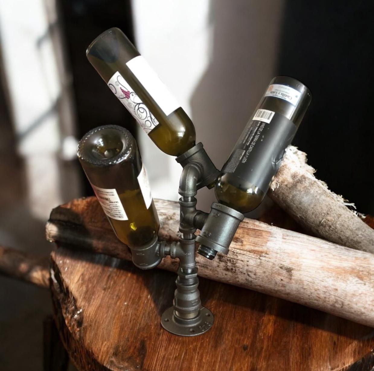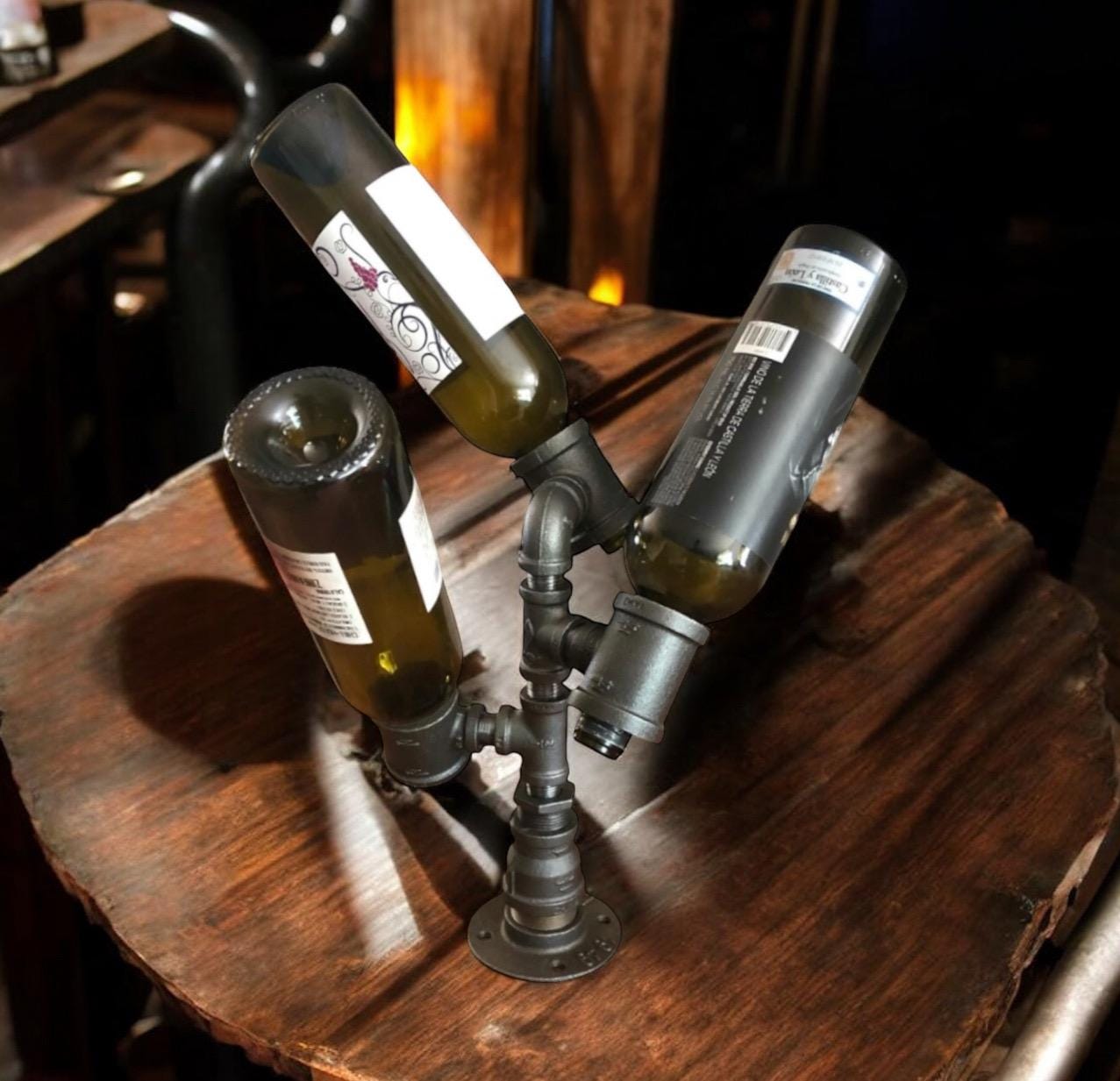 Black Pipe Wine Rack/Bottle Holder. Holds 3 bottles. Sturdy construction and hand made (fully assembled option) using construction grade iron pipe. All components are new.
