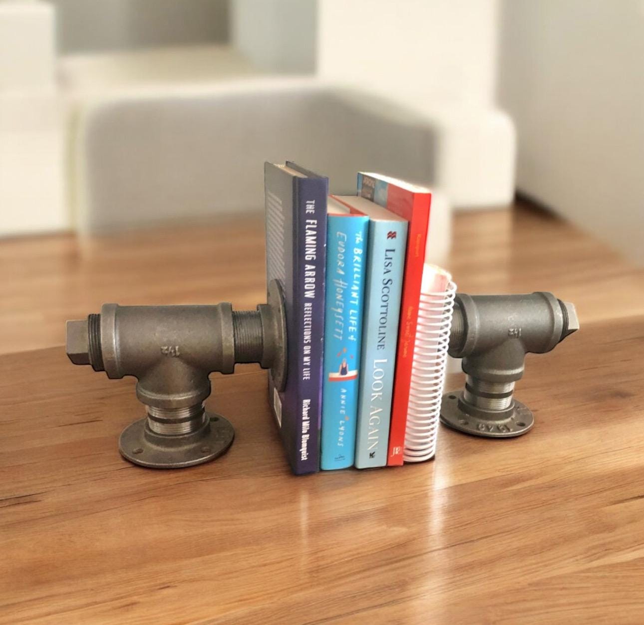 1” Industrial black pipe, 6” tall and 7” wide. Total weight is 3.1 pounds for each bookend. Heavy enough to hold up to 8 books in place.