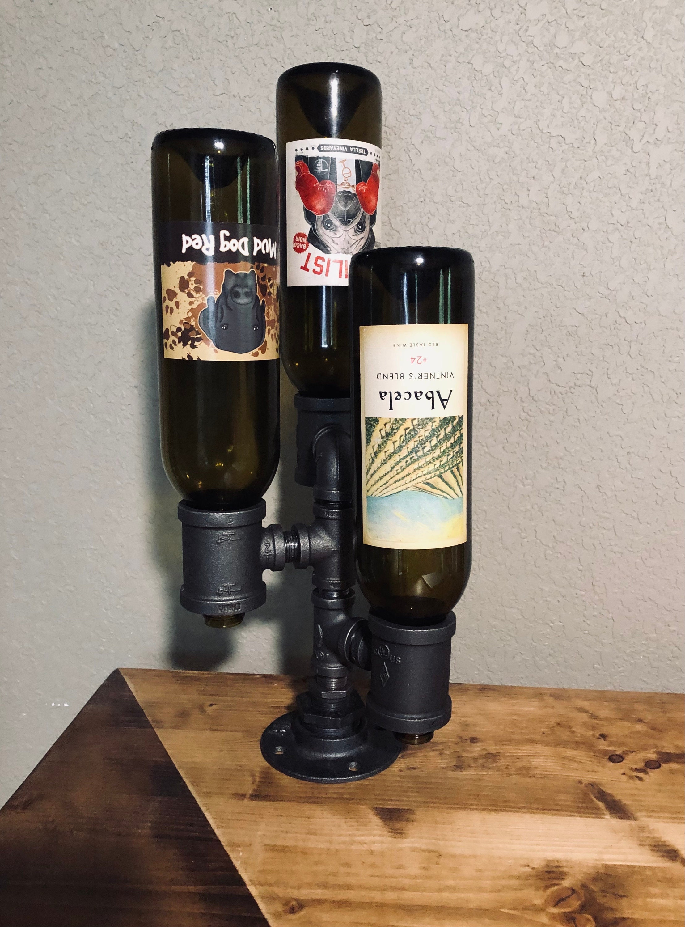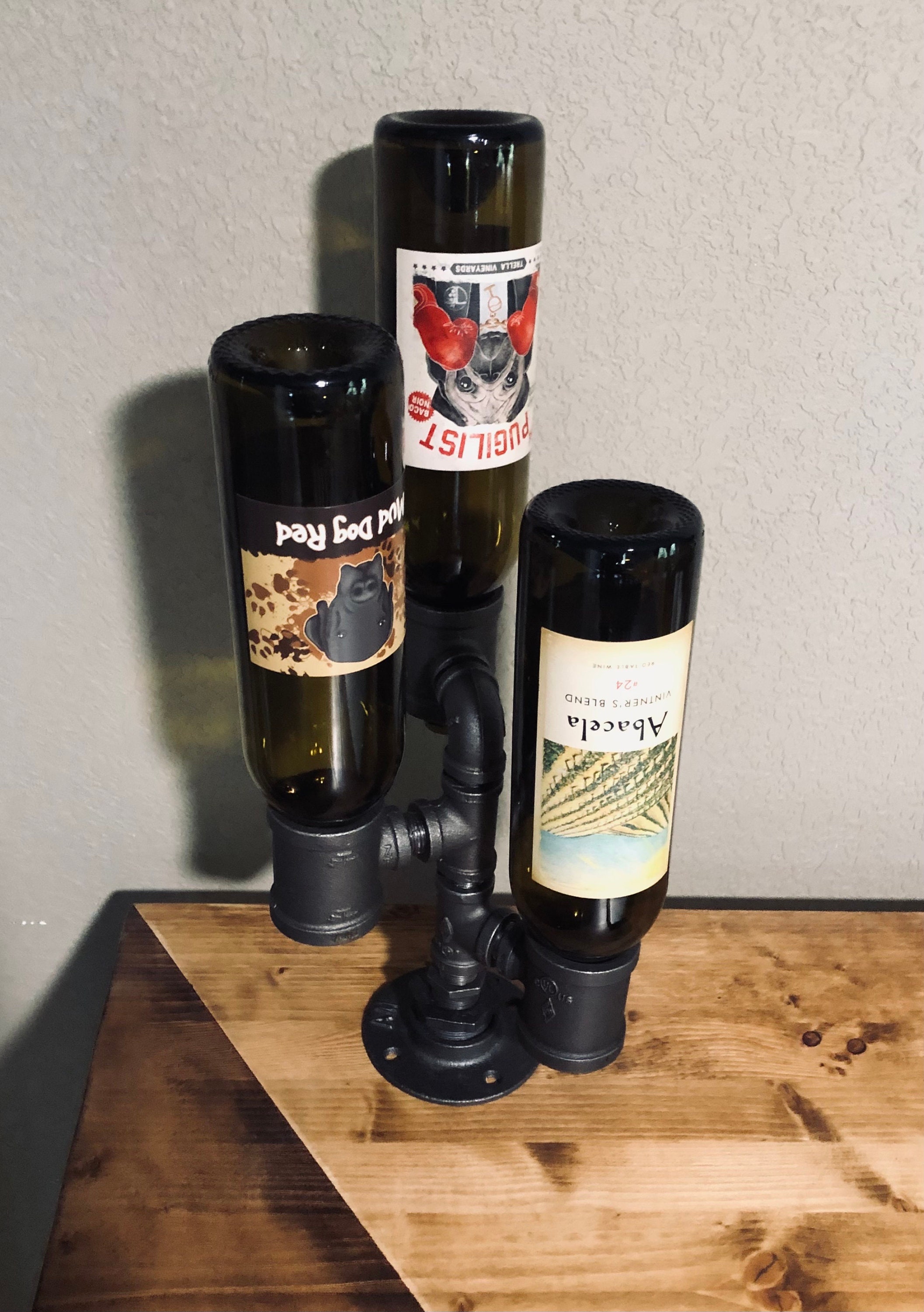 Industrial Pipe Wine Rack/Bottle Holder. Holds 3 bottles. Sturdy construction and handmade fully assembled using construction grade iron pipe. All components are new.