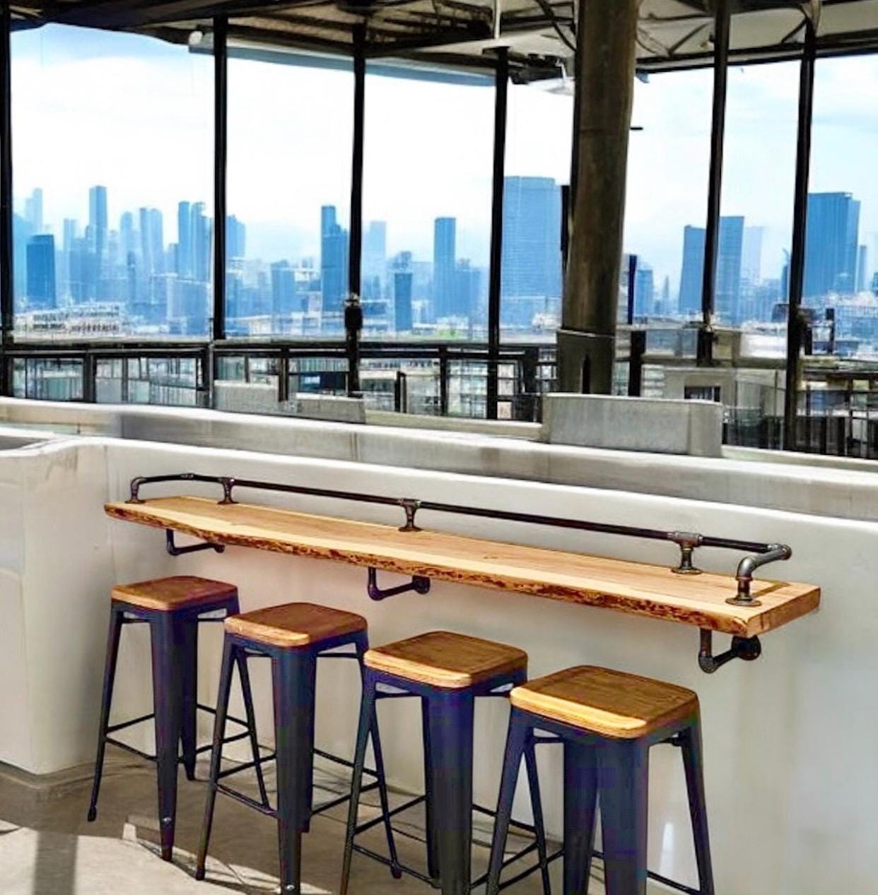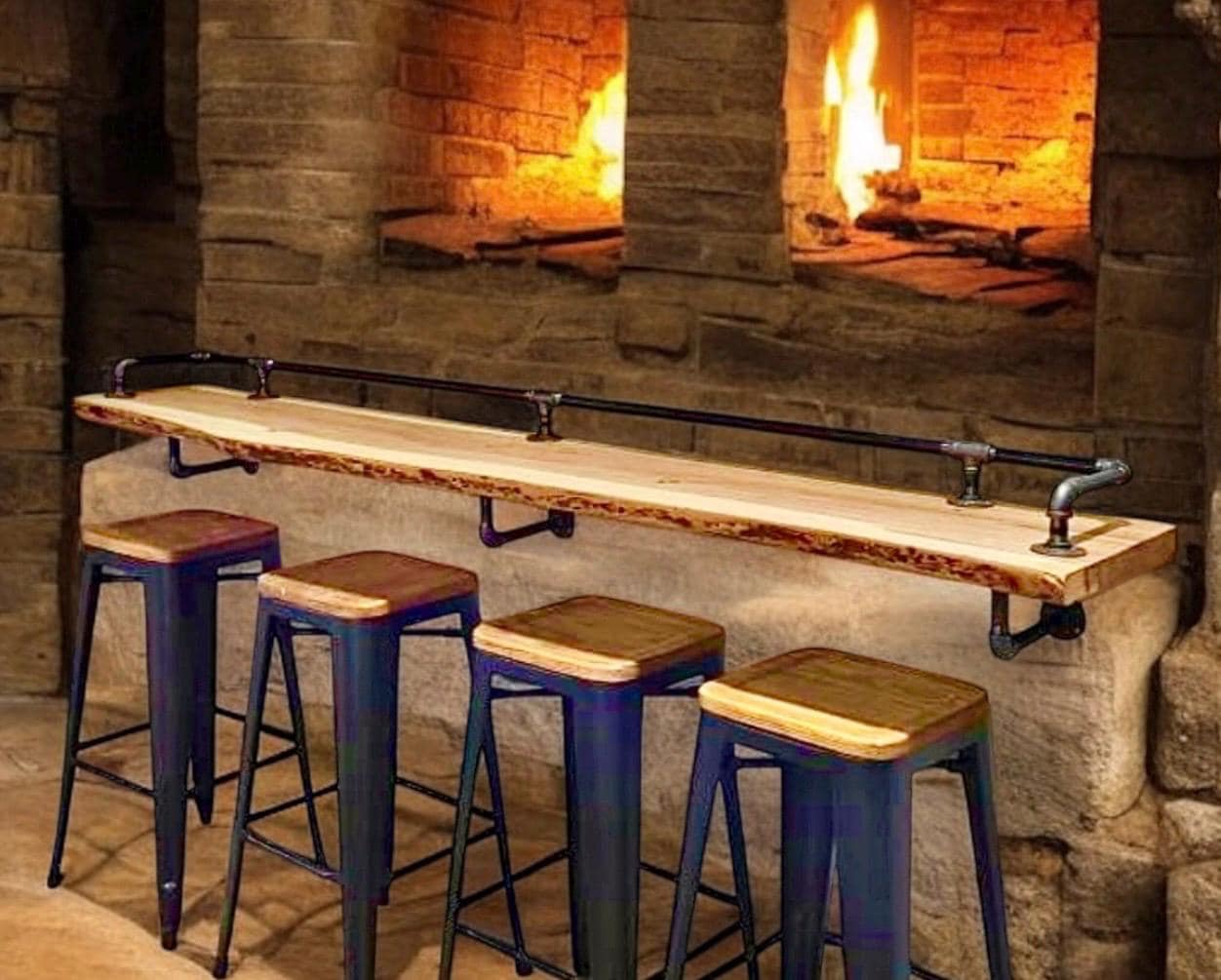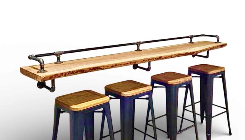 Elevate your home bar or restaurant setup with this space saving drink/eating table shelf Industrial Pipe Bar Rail Kit, crafted from high-quality, durable industrial pipe hardware for an authentic drink rail experience.