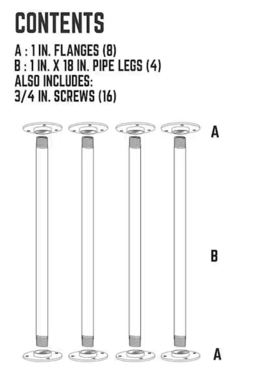Each kit comes with (4) 1 in. x 12 in. steel pipes, (8) round flanges, (16) screws, assembly instructions, and a clean and seal sheet