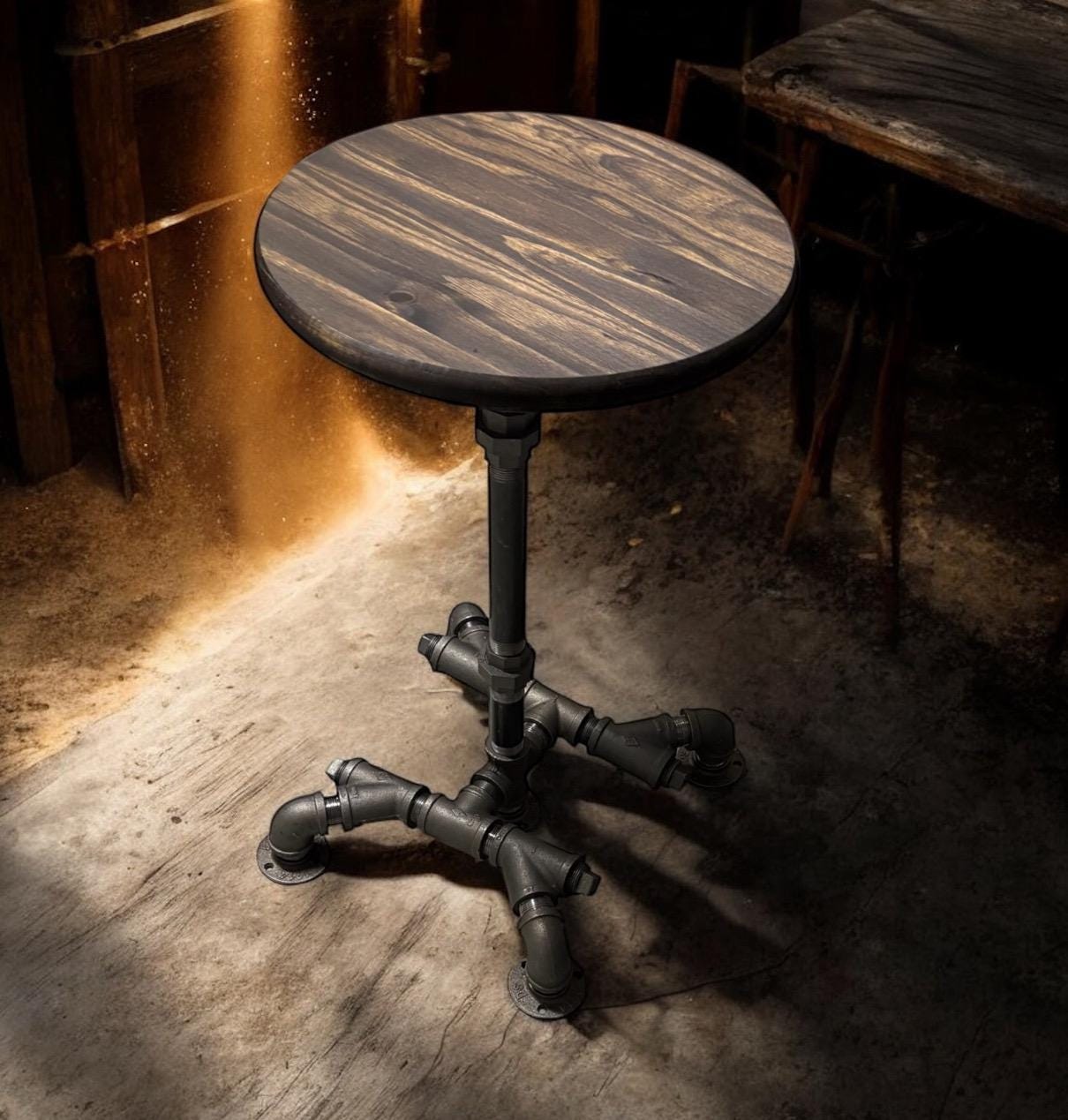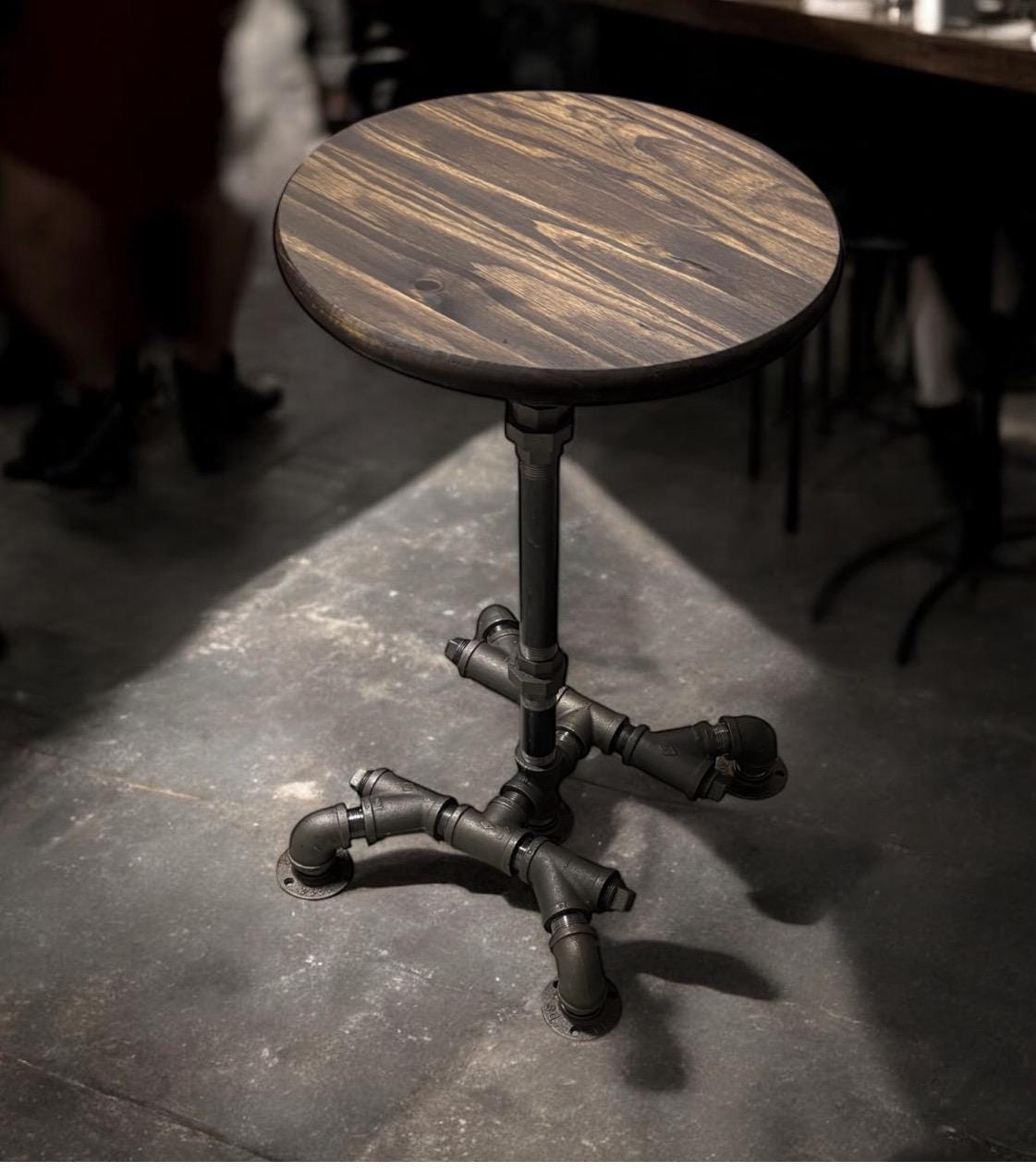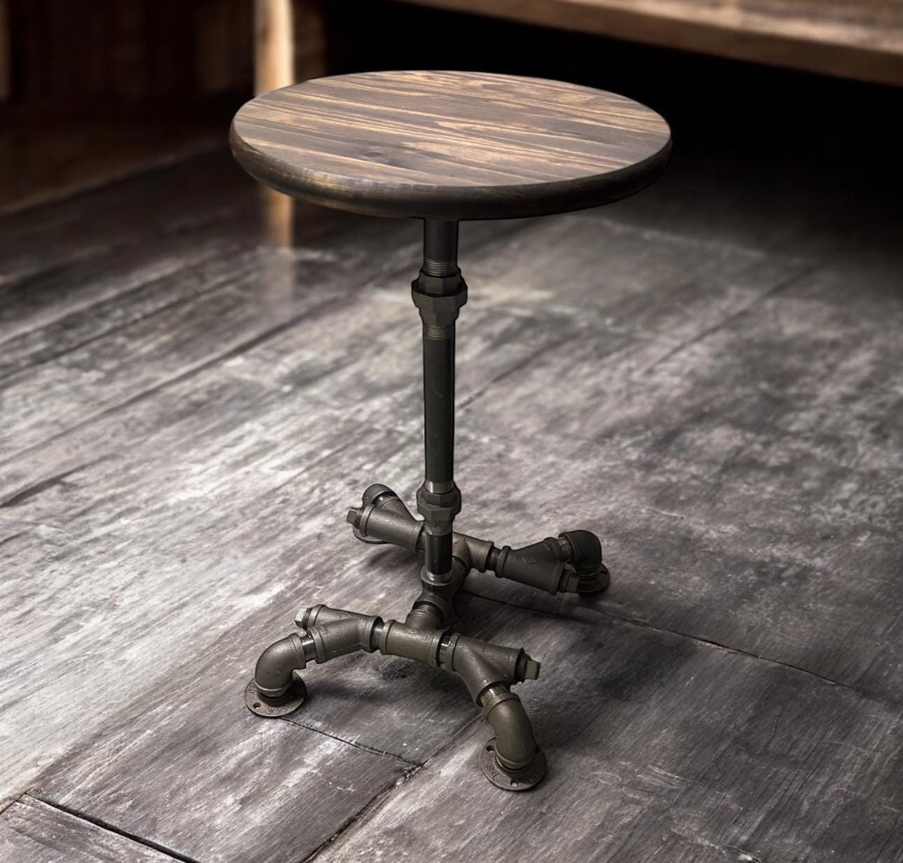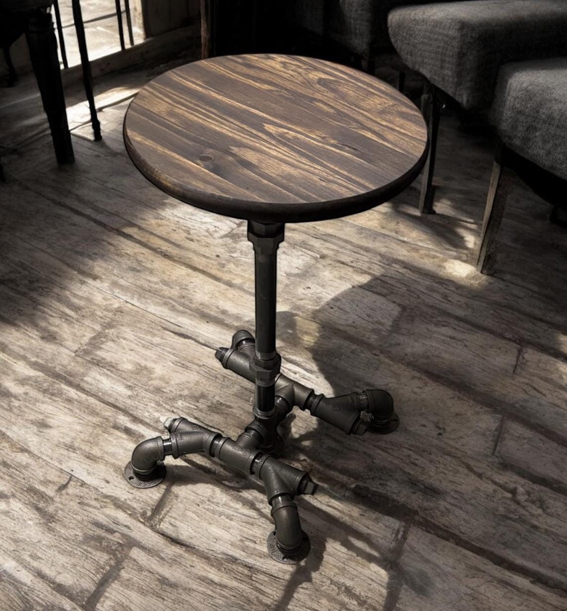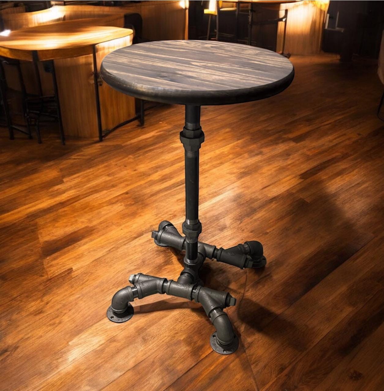 36" Tall x 15” wide base with 15” Round Bar Table, Rustic Industrial Pub Table, Dark Walnut Pine Edge Glued Top Bistro Table With Metal Pipe Base (custom orders are available for this item)