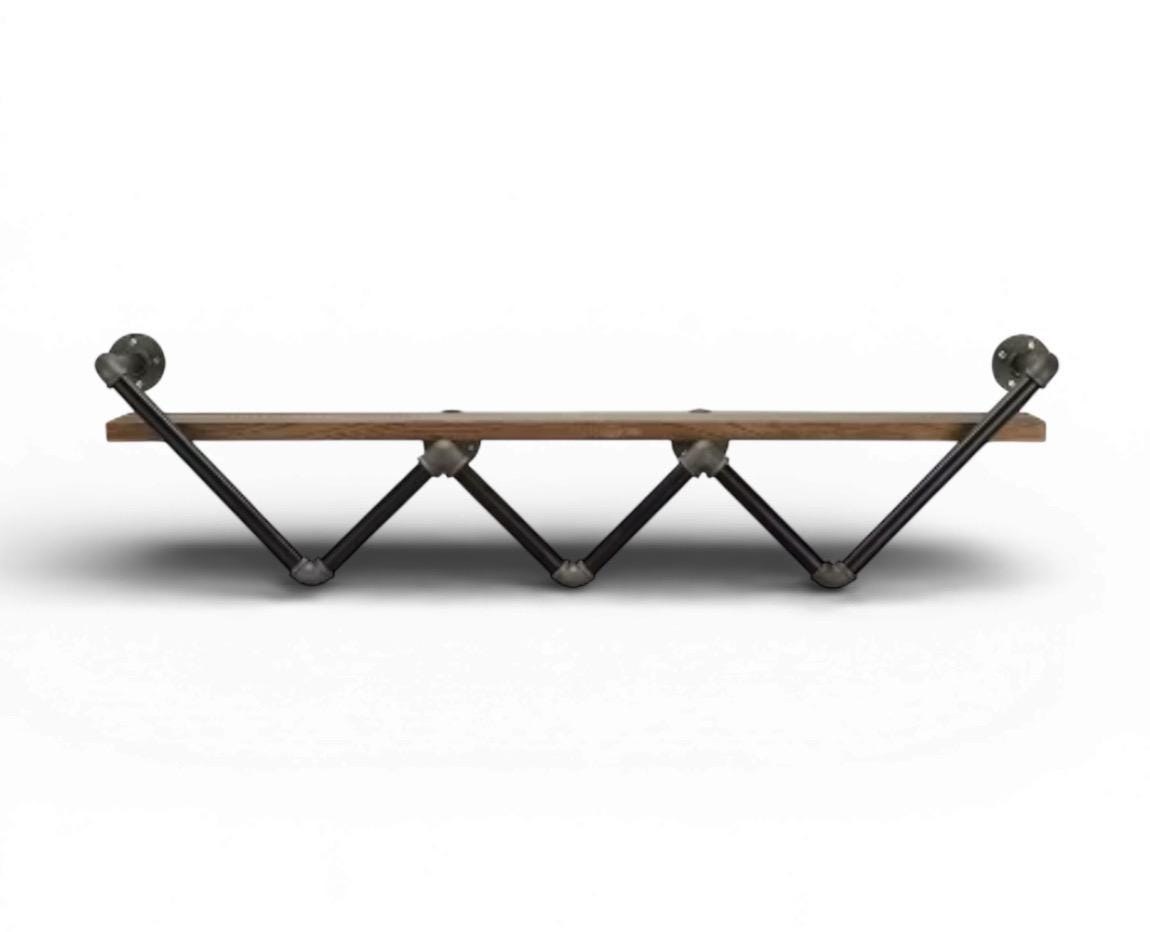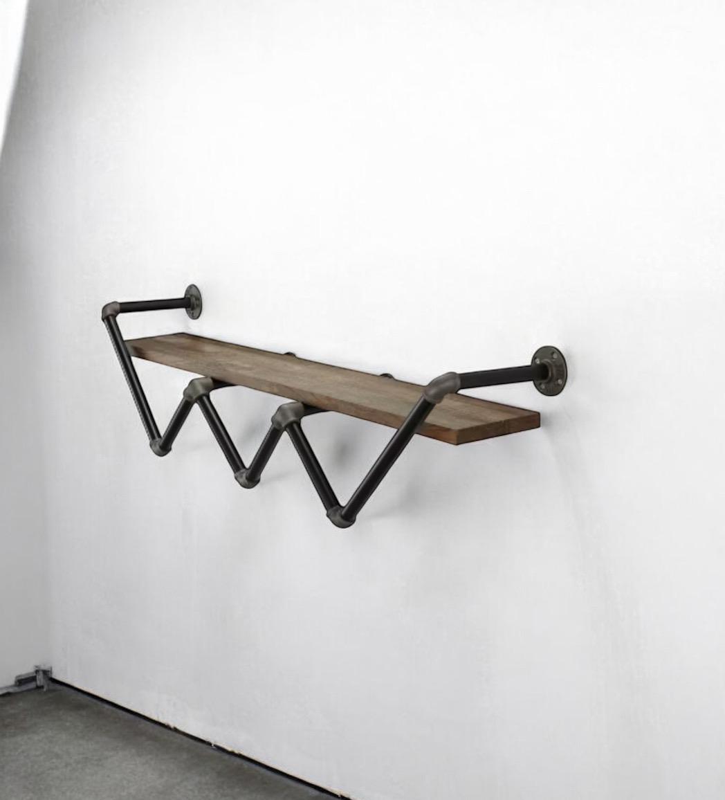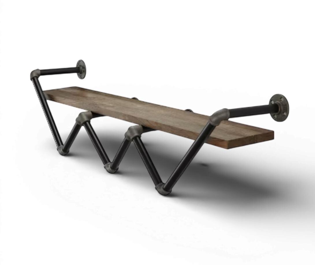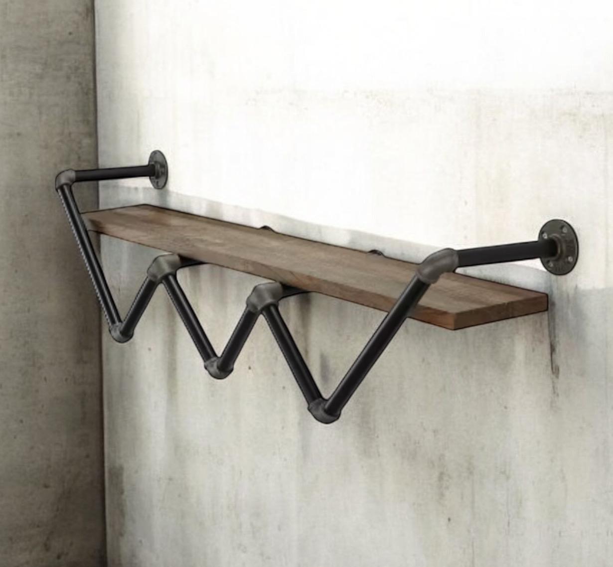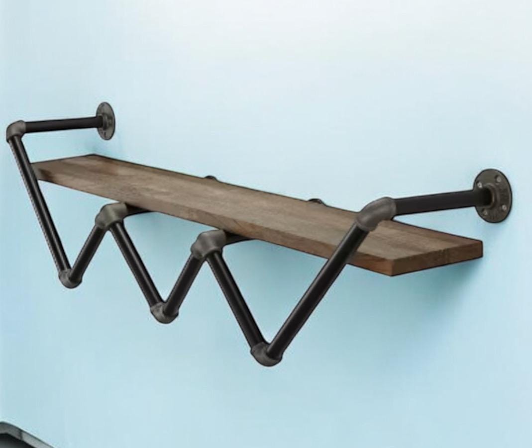 This wall shelf for the living room features a zig-zag pipe frame that holds a single shelf with a 50 lbs. weight capacity and gorgeous natural wood grain color perfect for an industrial-inspired interior. It requires 16 installation holes and at least 2 adults for the assembly. Perfect for displaying books, photos, or another decor.