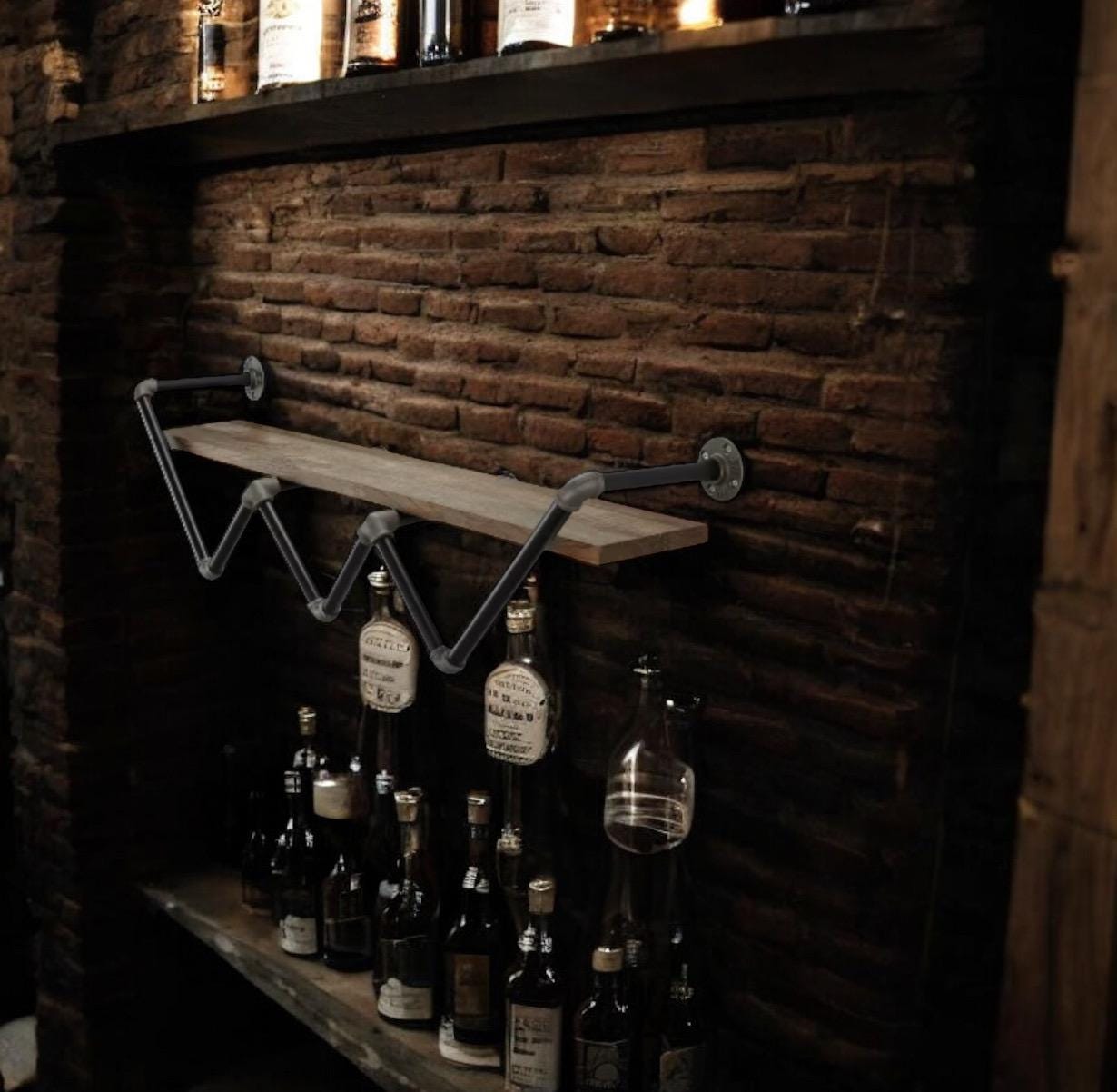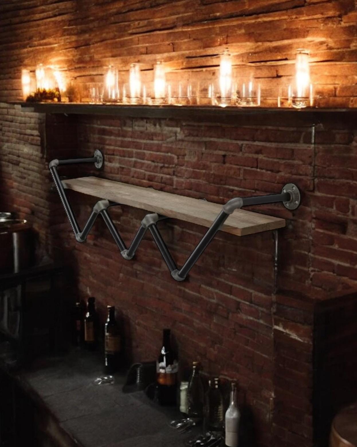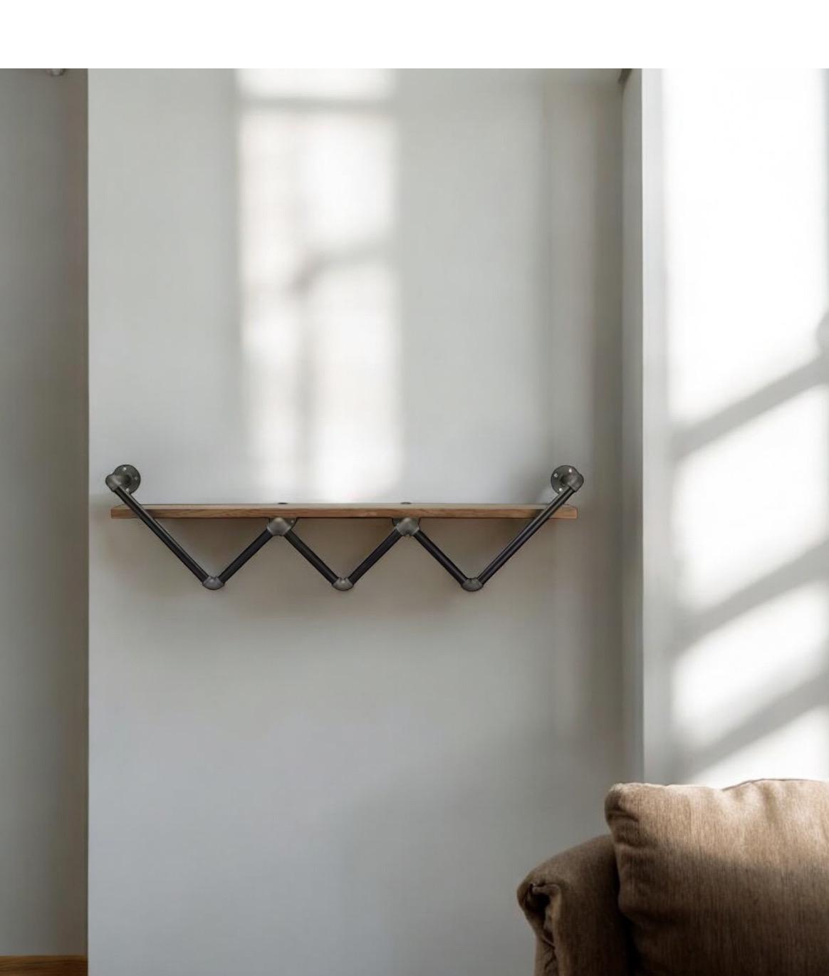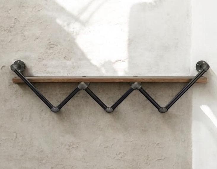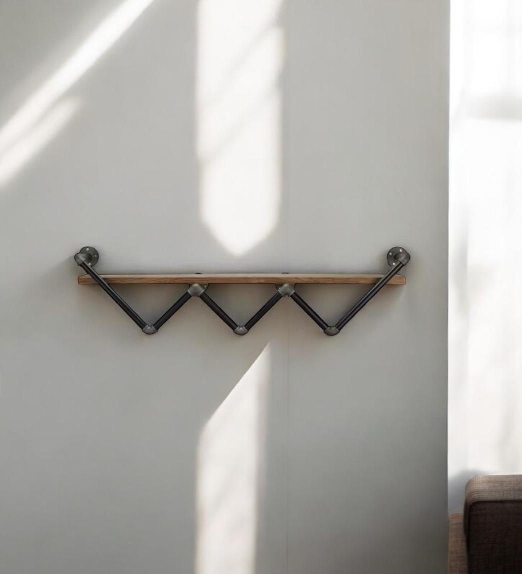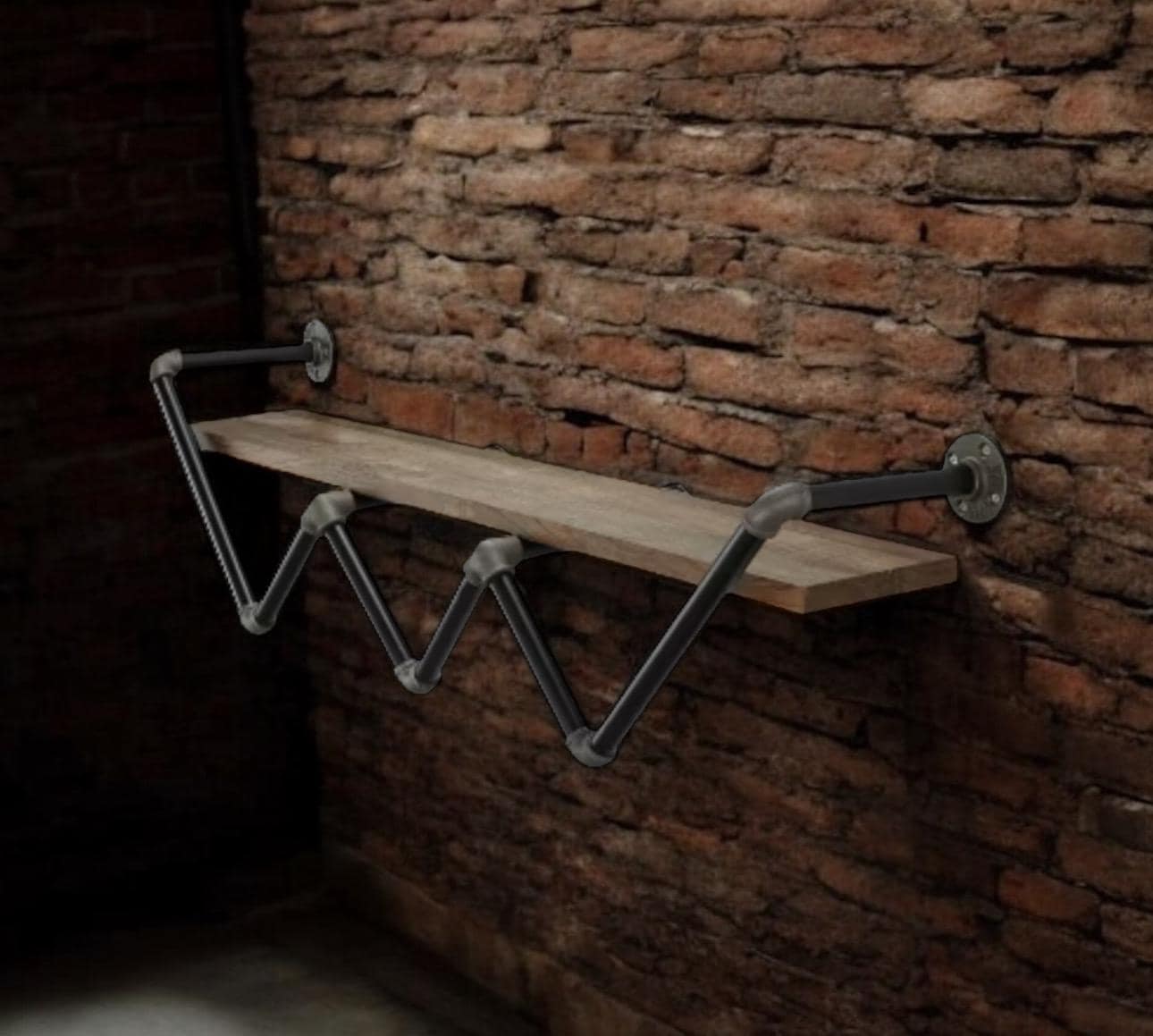 This wall shelf for the living room features a zig-zag pipe frame that holds a single shelf with a 50 lbs. weight capacity and gorgeous natural wood grain color perfect for an industrial-inspired interior. It requires 16 installation holes and at least 2 adults for the assembly. Perfect for displaying books, photos, or another decor.