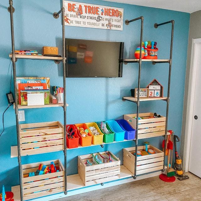 **NOTE: the pipes and connecting fittings sold with this shelving kit are authentic and used in construction projects. The shelving kits sold on Amazon are not the real deal and therefore are very thin metal compared to my pipes and fittings and therefore are not made to last long.