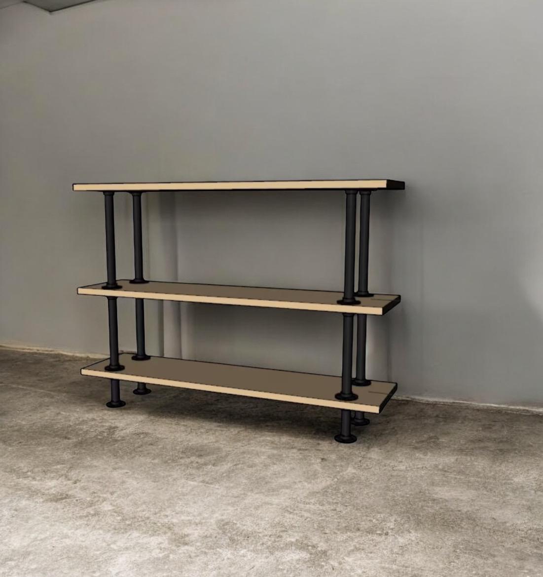 Constructed from sturdy 1/2" diameter black iron pipe and fittings, this shelving unit can hold up to 300 pounds.